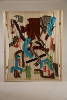 The final piece of my thesis was this bidirectional fabric patchwork "tapestry". The concept behind the piece was to visualize decision-making. After designing and making a small custom knife, I stretched a 60"x 36" canvas and asked my peers to approach and then cut into the canvas with the knife. Some cut more violently, slashing at the piece, and others were more deliberate using the knife as a paintbrush. After cutting the canvas, I asked them to select a fabric that they had an immediate reaction to. I cut fabric patches for their personalized destruction of the canvas and patched the piece. The result was a tapestry where each fabric was a representation of a specific person. One side is a colorful and somewhat playful interaction of a variety of interesting colors and textures. The other side is a more violent collection of marks, with a small amount of color peeking through the slashes.